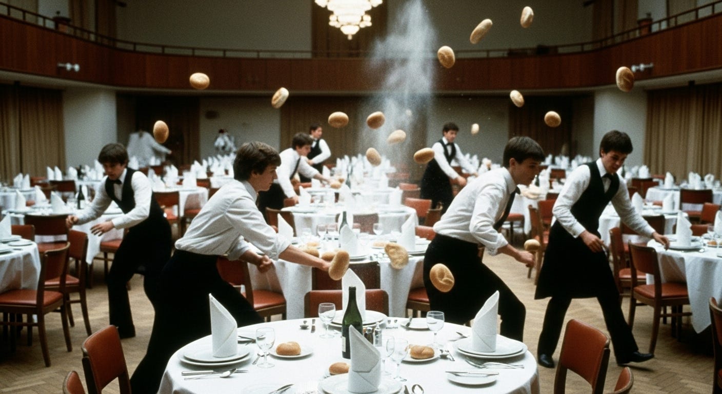 The night before, bread rolls had flown. Arcs of flour-dusted bread, soft thuds against shoulders and walls. Crumbs clung to our clothes. We picked up the rolls, brushed them off, and set them back on the plates. Napkins folded into the shapes Mrs. Simpson insisted on, lined sharp as soldiers. I still fold them that way. Laughter too loud in the empty ballroom, the kind that dared someone to catch us. Flour hung in the air, sticking to sweat, catching the light.