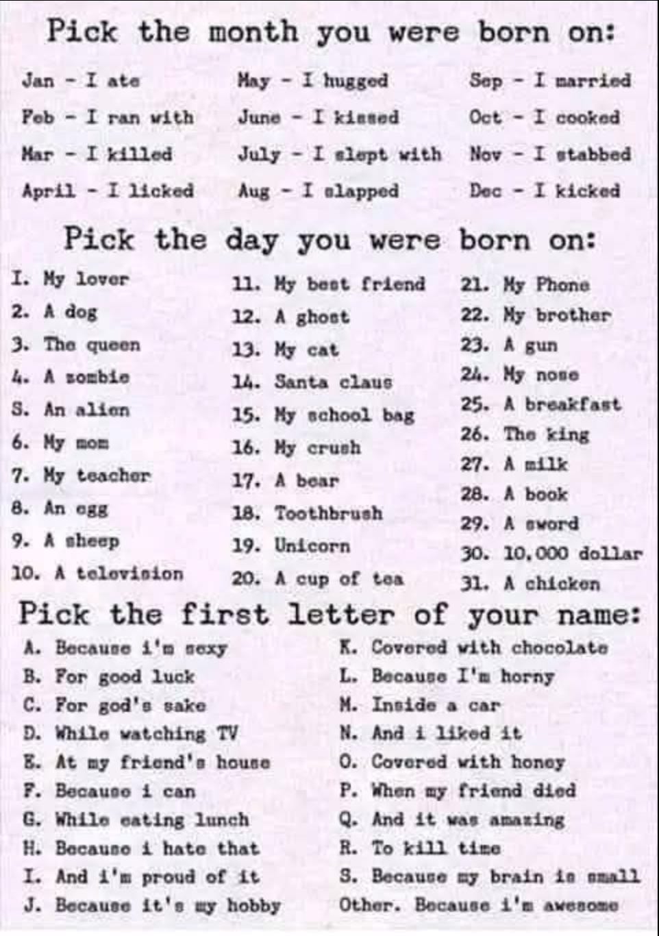 I came across this old-school meme on Facebook and couldn’t resist. You know the kind—pick your birth month, day, and the first letter of your name to generate a weird sentence.