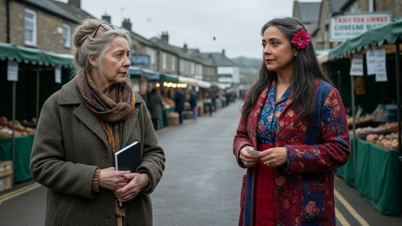 She stood just beyond the greengrocer’s awning, where the wind funneled between the bakery and the charity shop and made paper signs behave like living things. She was not browsing. She was not waiting in the manner of people who wished to be noticed as waiting. A single flower had been set into her hair with quiet care. Her clothes carried more colour than the day seemed to expect, though nothing about her asked for attention. Maggie noticed the flower first.