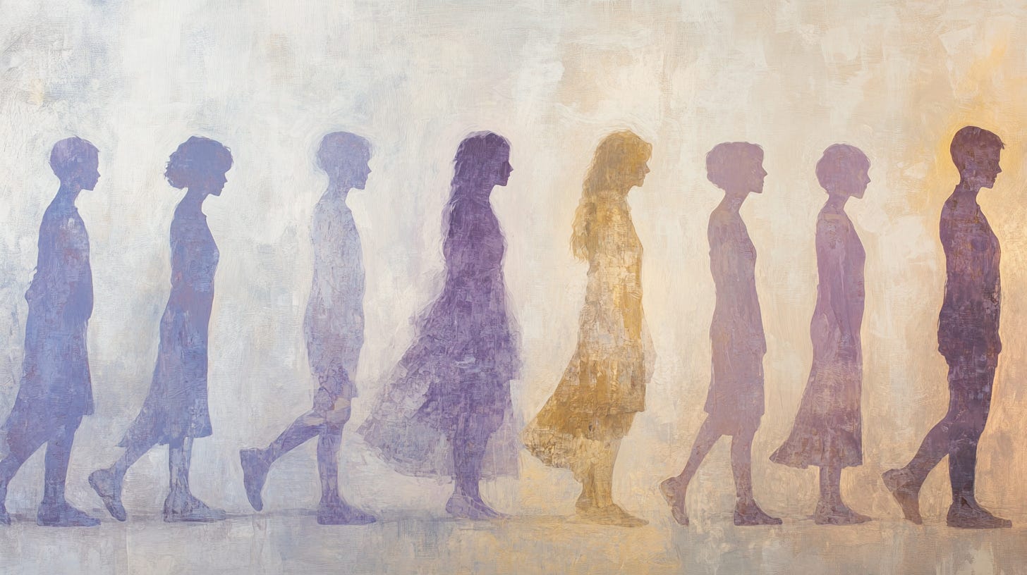 A long corridor, flickering with candlelight. On either side: tall, tarnished frames. In each one, a version of herself. A different age, a different ache. Some are quiet. Some are crying. Some are trying so hard to smile.