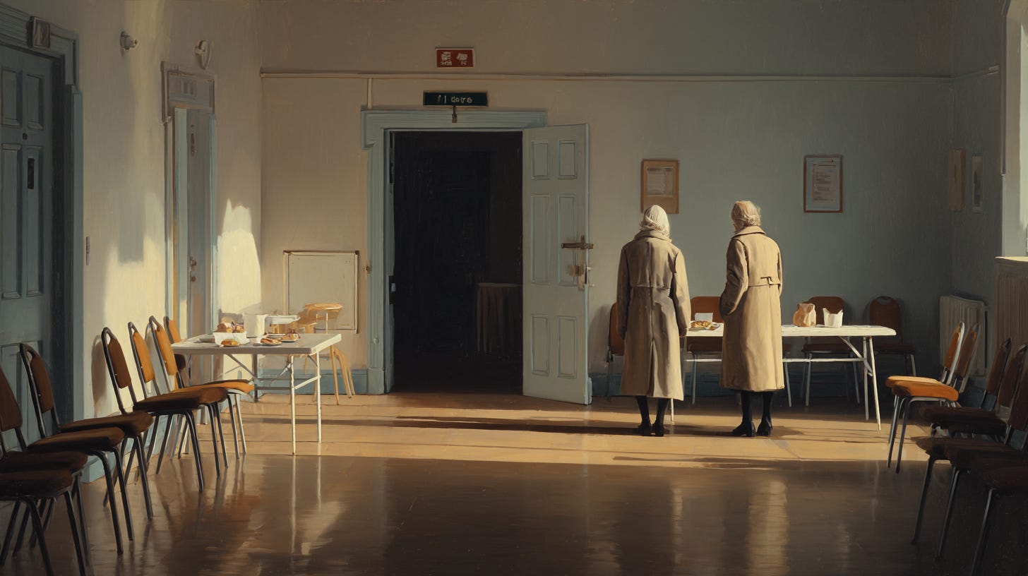 Two women sat near the front, stiff in their seats. Twin grey perms. Identical beige macs. Miss Stanley and Mrs. Roper. Former staff. Long retired. One clutched a handbag with both hands.